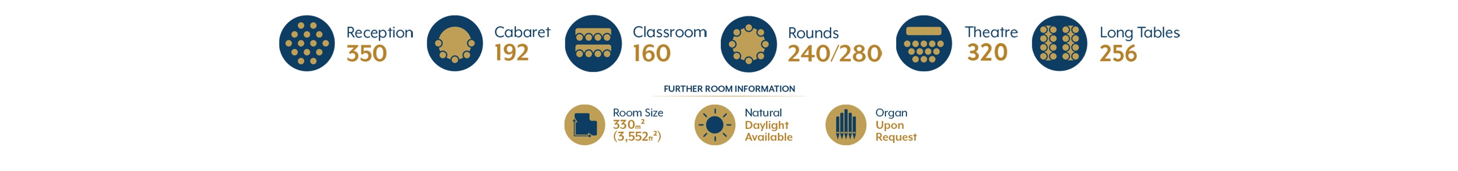 The three metre high stained glass windows flood the Hall with natural light and the lofty ceilings offer grandeur and space. The dais offers a natural focal point for the room, making this a versatile space, as accommodating to conferences and presentations as dinners and ceremonies.