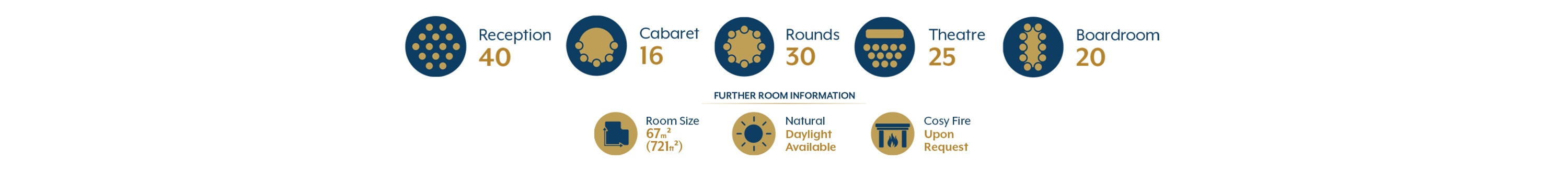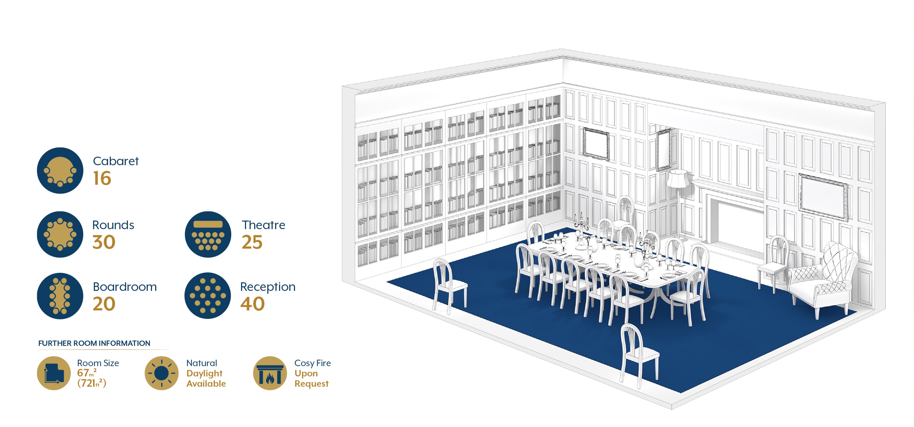 The Library is often used for intimate celebrations, candlelit dinners, client entertainment and working lunches. Wood panelling, rich upholstery and a cosy fire nestled in the centre of the room combine grandeur and warmth to make this space a particular gem.